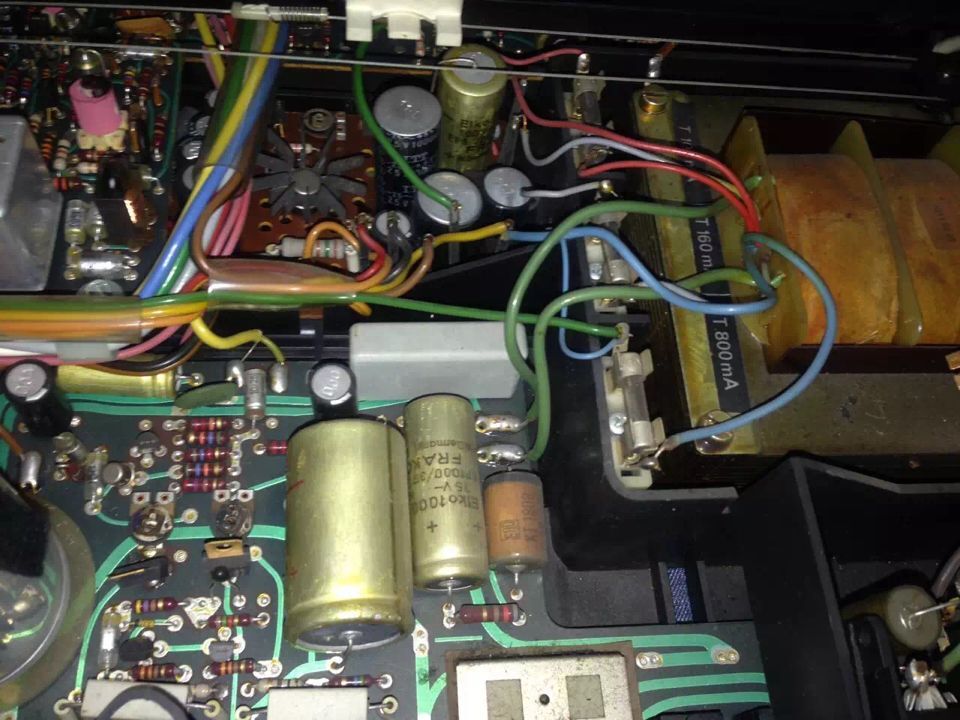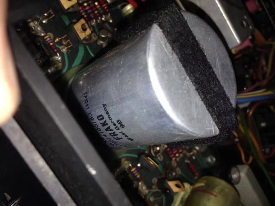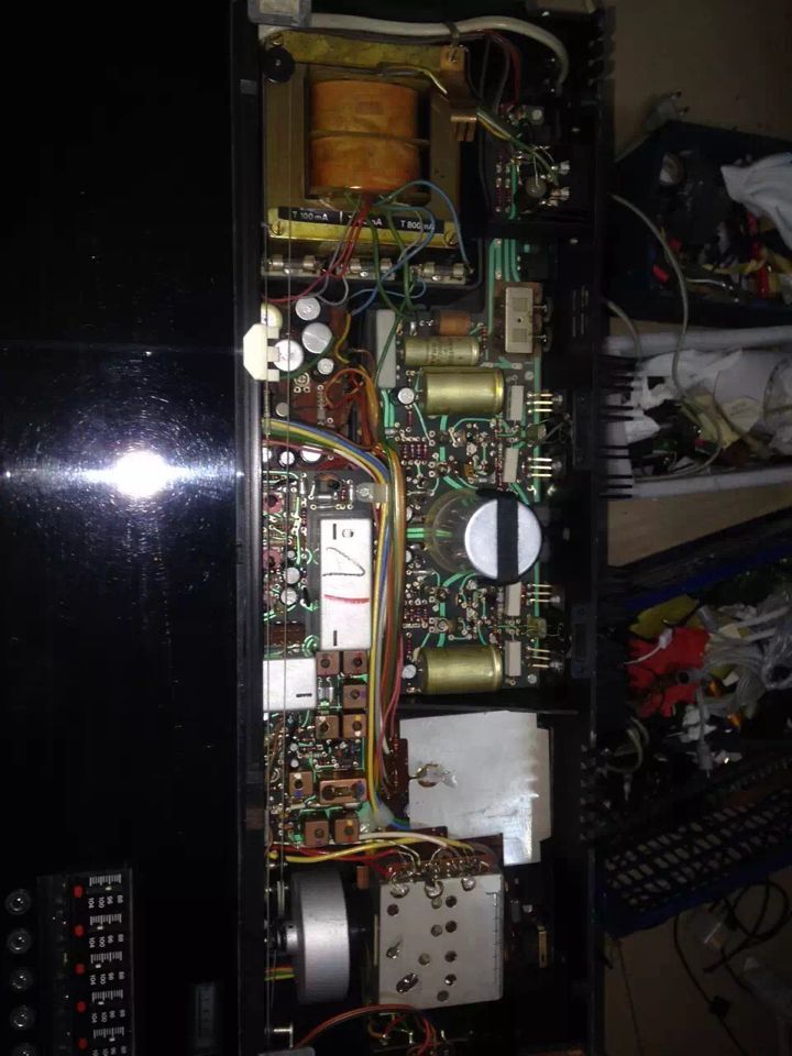 说完外面说里面吧。用料可以说用惨无人道来形容。整个机箱基本都横竖塞满了大大小小的线路板,大牛,大电解,大中周,大空气联(选择性非常好),还有大飞轮哦,调台的时候手感很不错(有阻尼和惯性),真的可以说是那个时代最高工艺的代表作之一吧。
